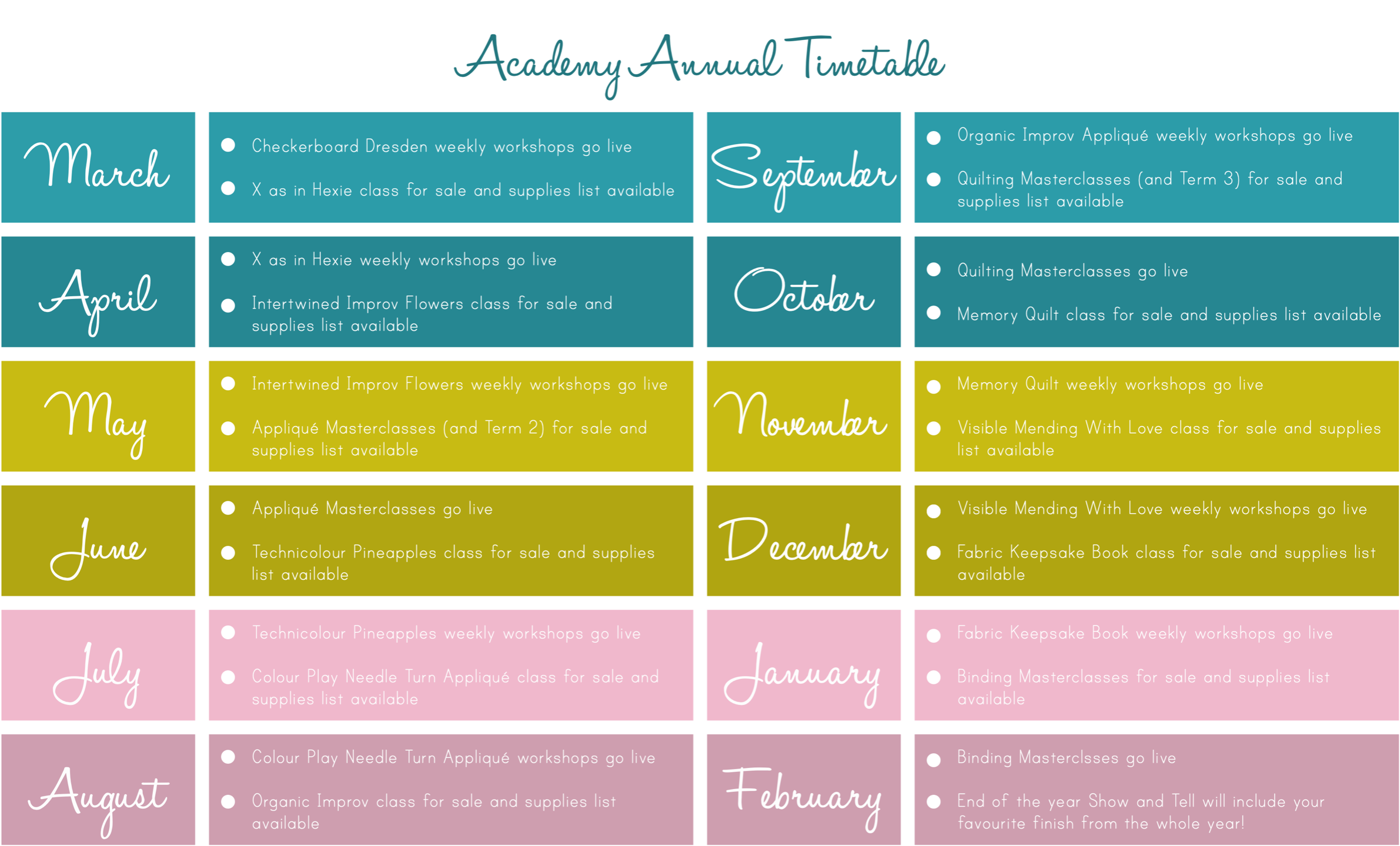 A whole year of weekly video workshops, masterclasses and zoom classes starting on 1 May 2025 with Jo, Karen and Lynne - includes full access to all of the taster weekend classes as well as our new BOM, Summer Sorbet.