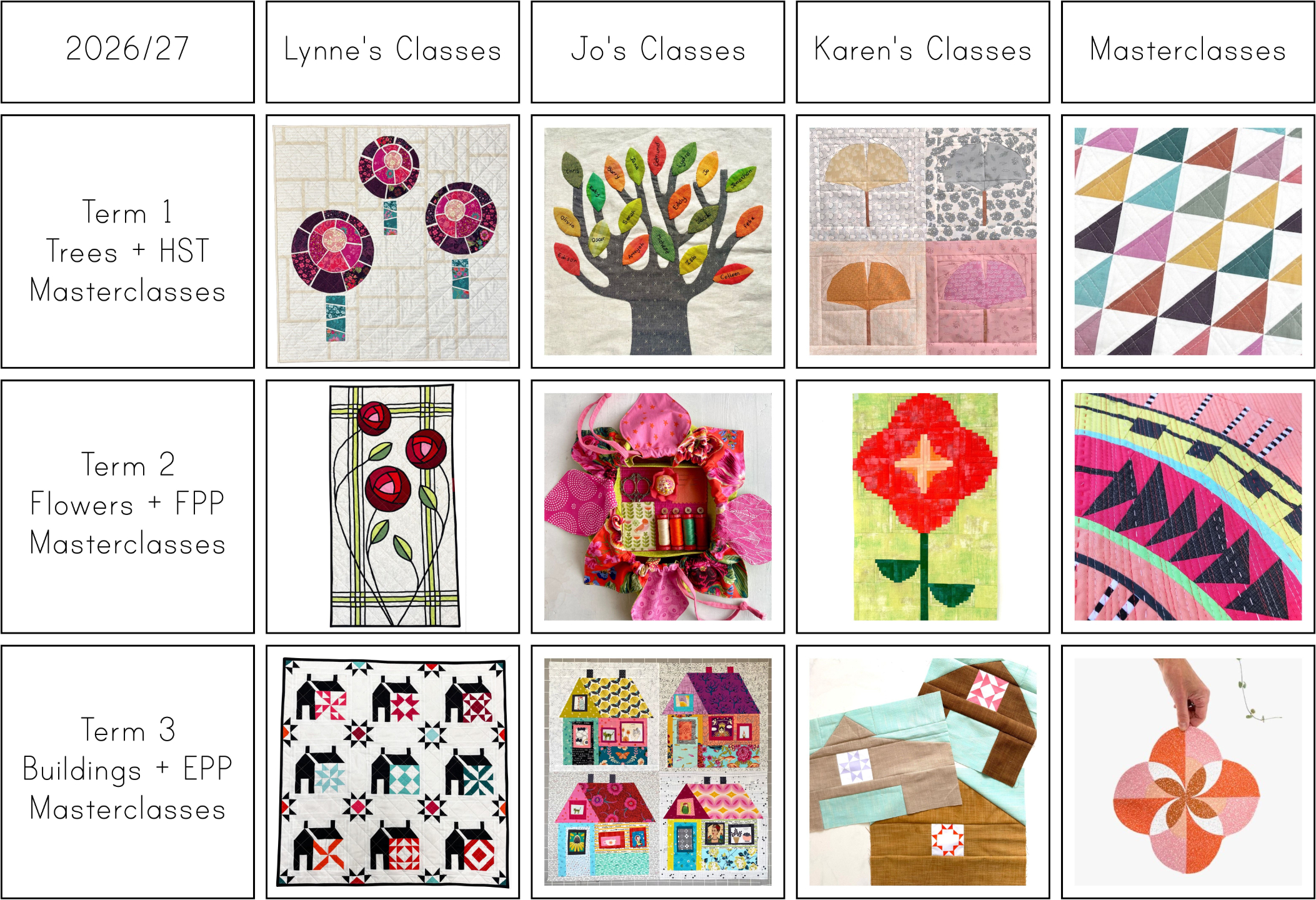 To top things off we will present a new series of Masterclasses. This year we are tackling all the quilting acronyms HST, FPP and EPP!
