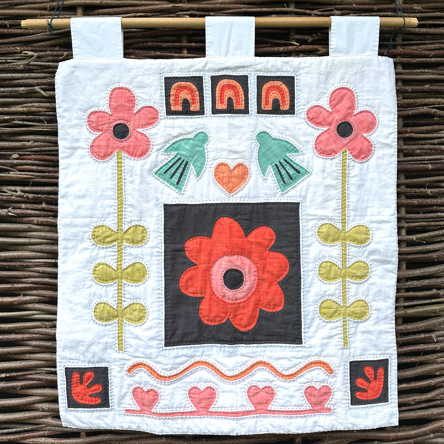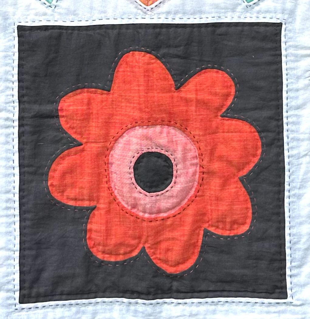Every stitch in Folk Garden, from the reverse applique to the quilting and finally closing off the quilt has been done by hand, making it a project you can take and do anywhere, enjpying the mindfulness as you go.