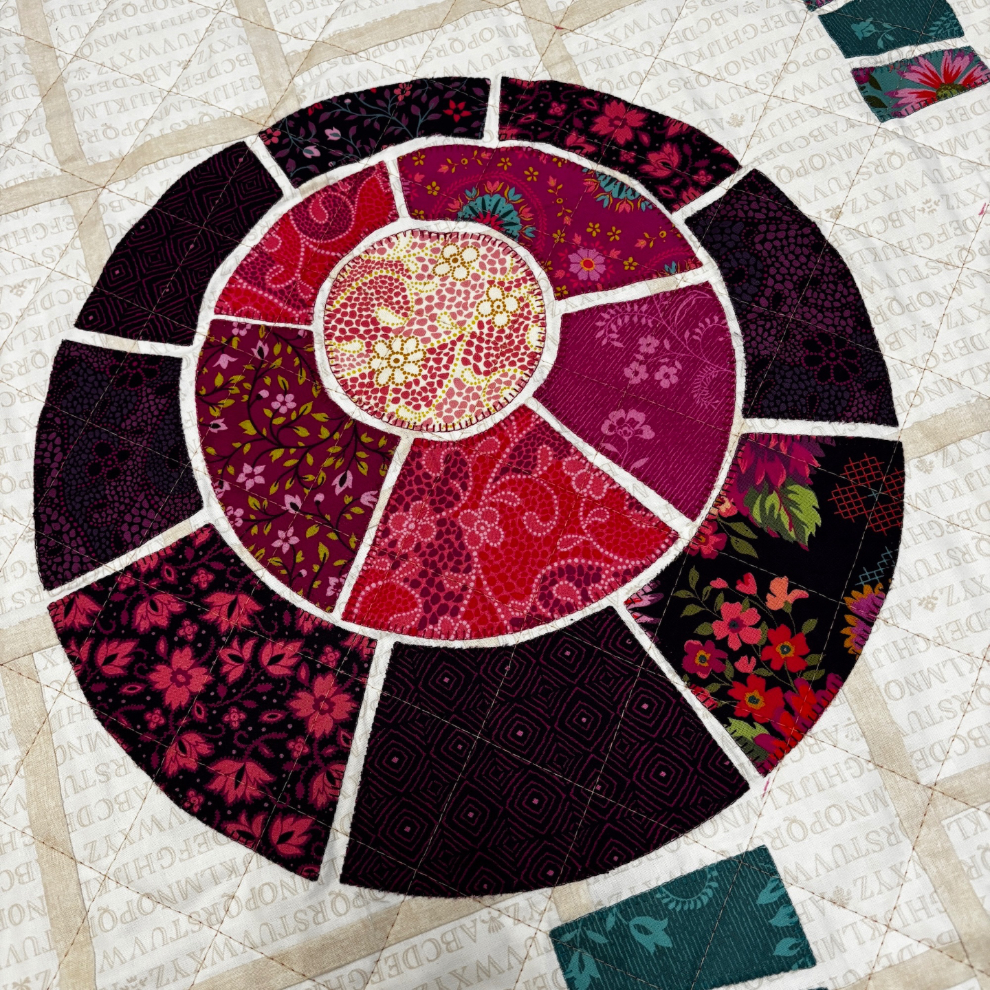 During week 3, we will be laying out the tree tops one by one, arranging them on the background, removing their backing papers, fusing them in place then stitching in place to secure.