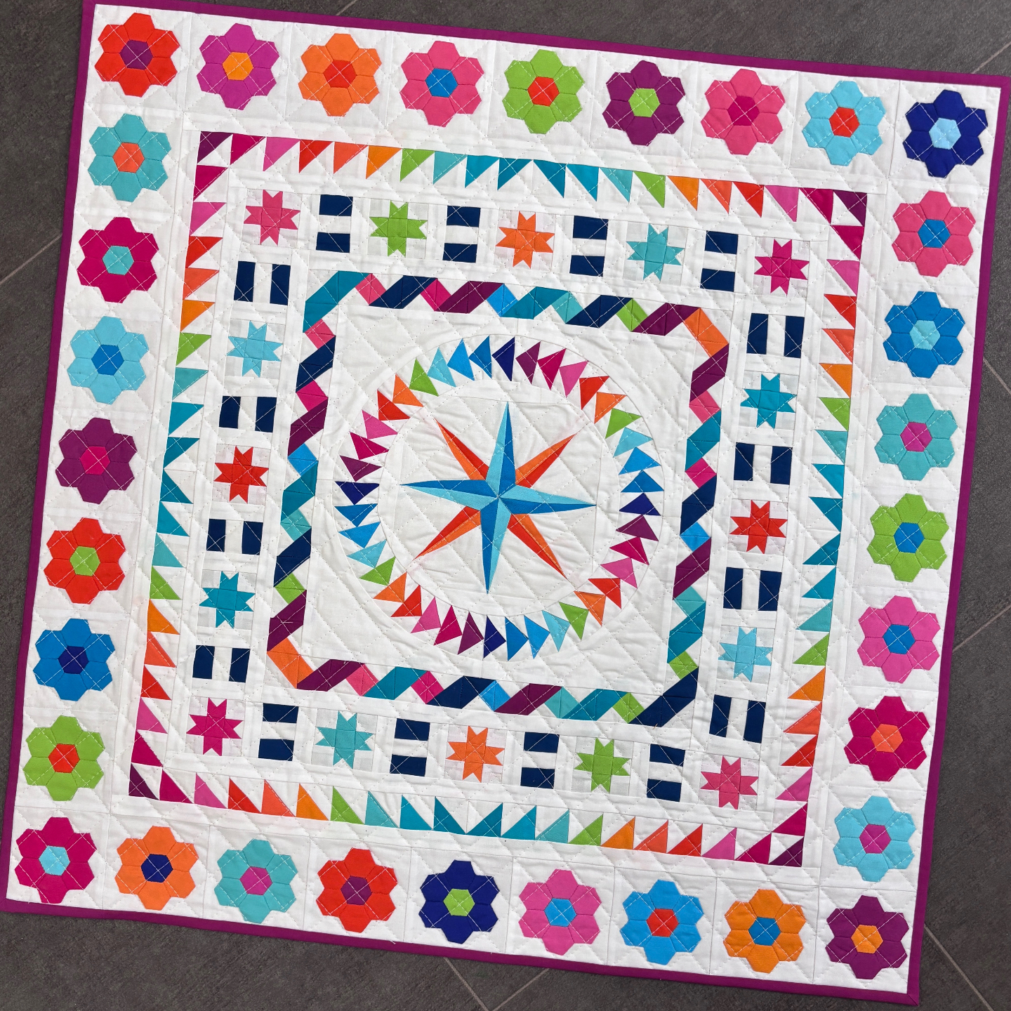 In the second half of week four, we learn English Paper Piecing on a tiny scale, making lots of little grandmother's flower garden blocks for the final border of the quilt.