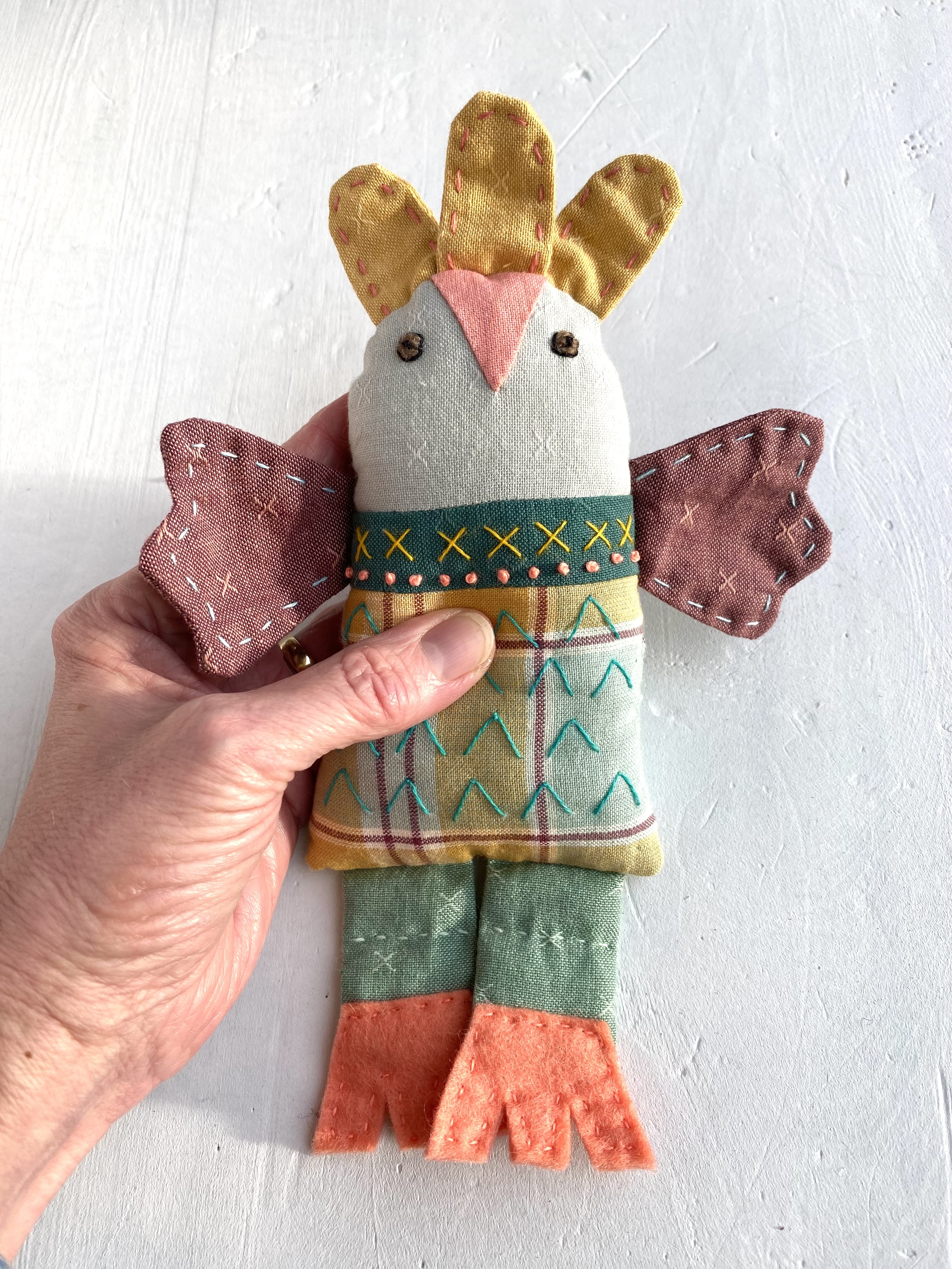 After a look at suitable fabrics and useful notions we will start to make our basic bird doll components such as wings, legs and body. We will add our hand stitched embellishment.