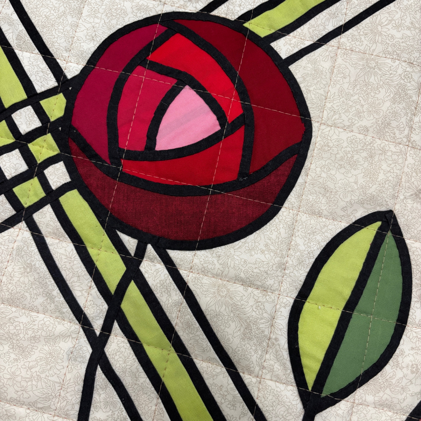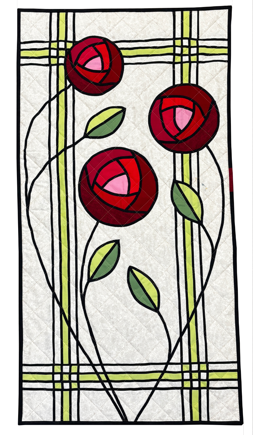 The wall hanging has a pieced background with the roses, leaves and stems added on top. The rose petals and the leaves are raw edge appliquéd to the background then bias tape is added to frame the roses and the leaves and to add stems into the design.